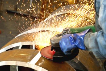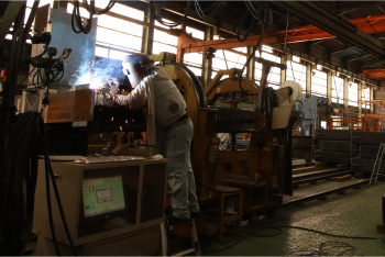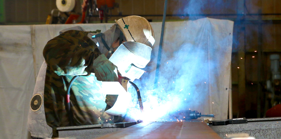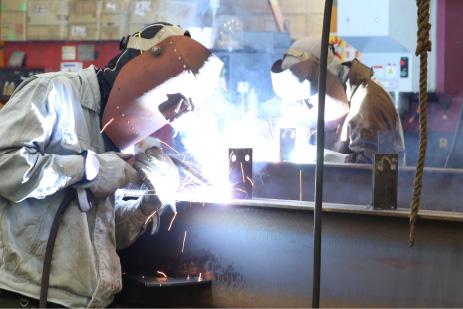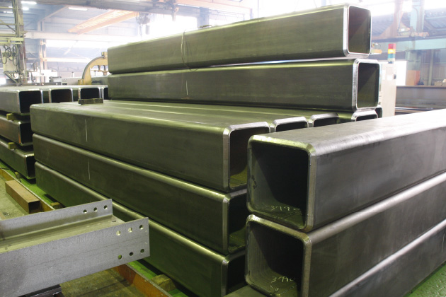 仕入れた鋼材は、一次加工と呼ばれる切断や穴開け加工が施されます。その後は表面に付いた酸化皮膜を落とすためのショットブラスト処理や構造上重要な部分には突合わせ溶接をする為に開先作業が施されます。