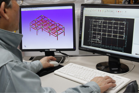建築を請け負うお客様から建物全体の設計図をいただき、そこから鉄骨部分だけを読み取り、加工に必要な鉄骨部材の数やサイズなどを鉄骨専用CADシステムにより割り出します。