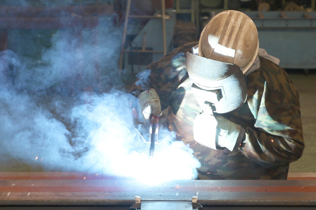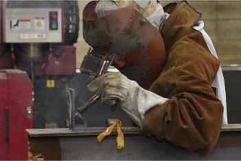 強度が求められる大きな鋼材はロボットで、それ以外の細かい部分は人間の手で溶接が行われます。板状の部材を溶接する際には、溶接熱でゆがまないようにあらかじめ逆側からも熱を入れます。