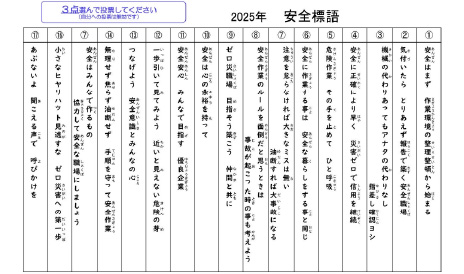 毎朝、全員で唱和する安全標語は社員一人ひとりが考え、社員投票で金賞を決めます。受賞者には社長のポケットマネーから金一封を贈呈!